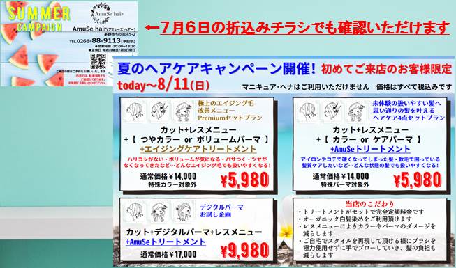 サマーキャンペーン開催(はじめてご来店のお客様)(茅野市のヘアサロン アミューズです)