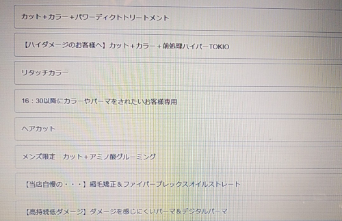 上記の画像が予約時に出てくるメニューとなります!かなりメニューを減らして載せてます。どぉしても、見にくくなってしまうので8個のメニューにさせていただきました。